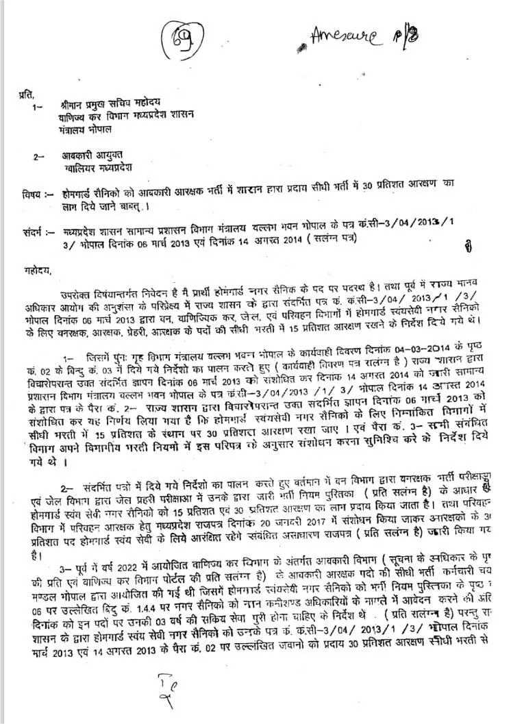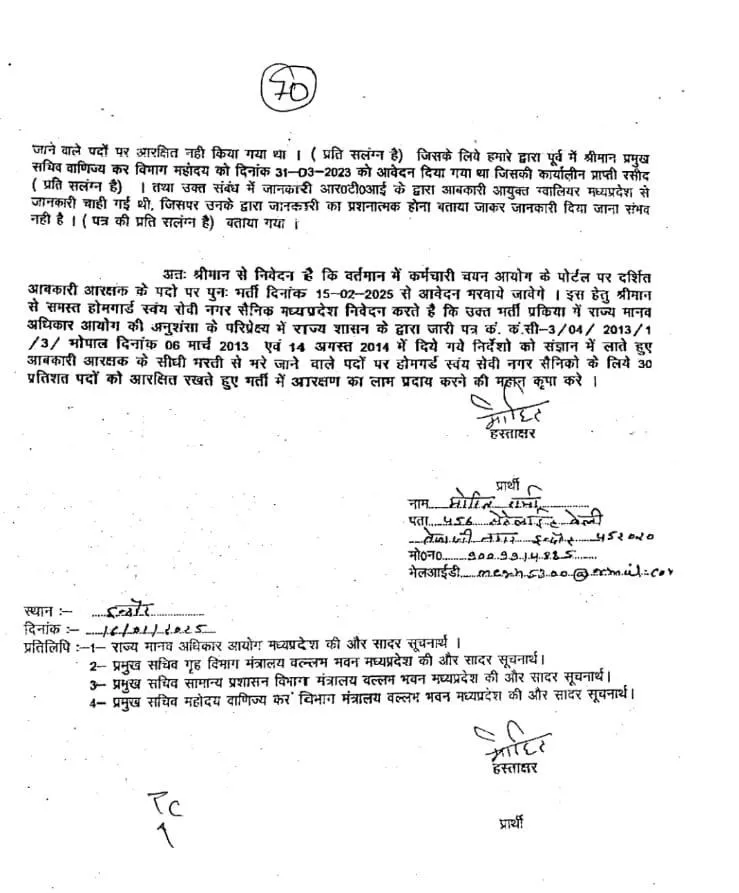 इनकी आपत्ति भर्ती विज्ञापन पर थी। इसमें होम गार्ड स्वयंसेवी नगर सैनिकों के लिए 30 फीसदी आरक्षण नहीं दिया गया है। मध्यप्रदेश सरकार के 14 अगस्त 2014 के नोटिफिकेशन का हवाला देकर कहा गया है कि यह आरक्षण दिए जाने का प्रावधान है। इसे भर्ती विज्ञापन में शामिल ही नहीं किया गया है।