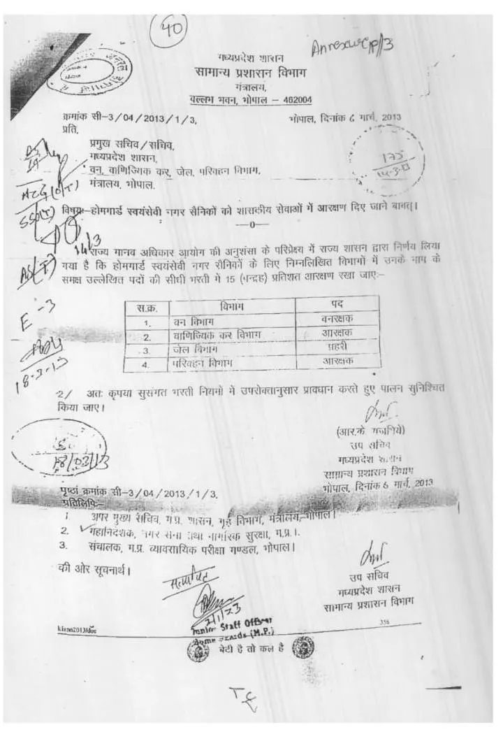 - मध्यप्रदेश सरकार ने राज्य मानवाधिकार आयोग के आदेश पर 6 मार्च 2013 को एक अहम कदम उठाया था। इस कदम के तहत, वन, वाणिज्यिक कर विभाग (जिसमें आबकारी विभाग भी आता है) और परिवहन विभाग में होमगार्ड स्वयंसेवी नगर सैनिकों के लिए आरक्षण लागू किया गया था। इन विभागों में वनरक्षक, प्रहरी और आरक्षक के पदों पर सीधी भर्ती में 15 फीसदी आरक्षण के प्रावधान किए थे।