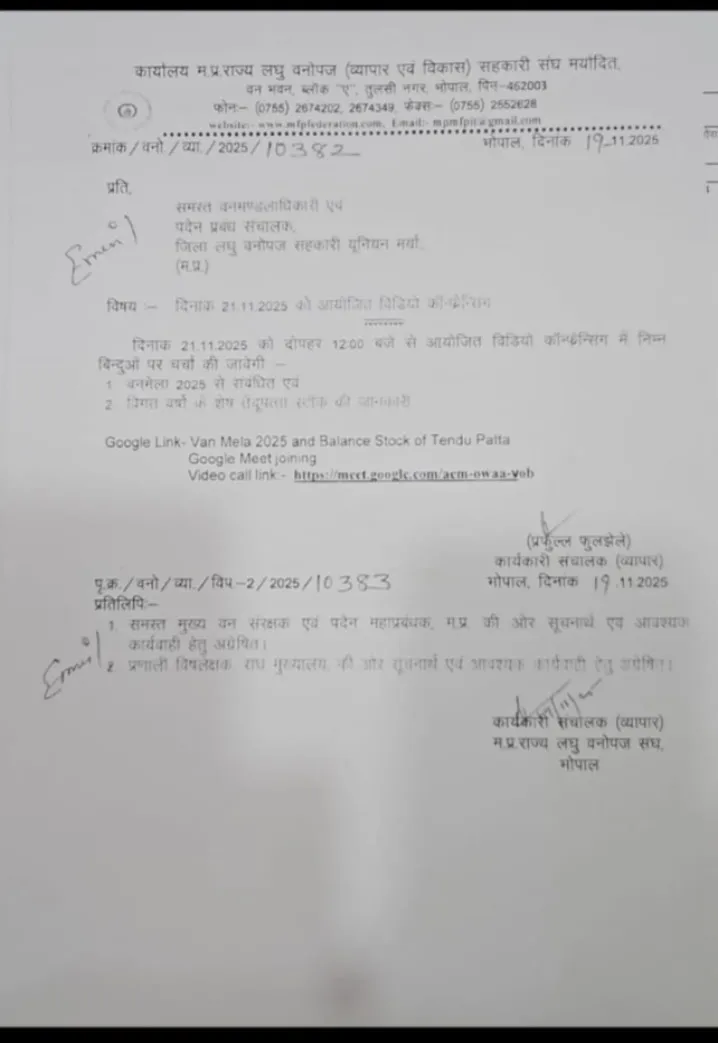 हैरत की बात यह कि विभाग प्रमुख के आदेश को मुख्यालयस्तर पर ही नजरअंदाज कर दिया गया। प्रस्तावित वन मेला को लेकर मप्र राज्य लघु वनोपज संघ के कार्यकारी संचालक प्रफुल्ल फुलझरे ने 21 नवंबर, शुक्रवार को वीडियो कांफ्रेंस बुलाई। इसमें क्षेत्रीय वन मंडलाधिकारियों यानी डीएफओ को भी जोड़ा गया।