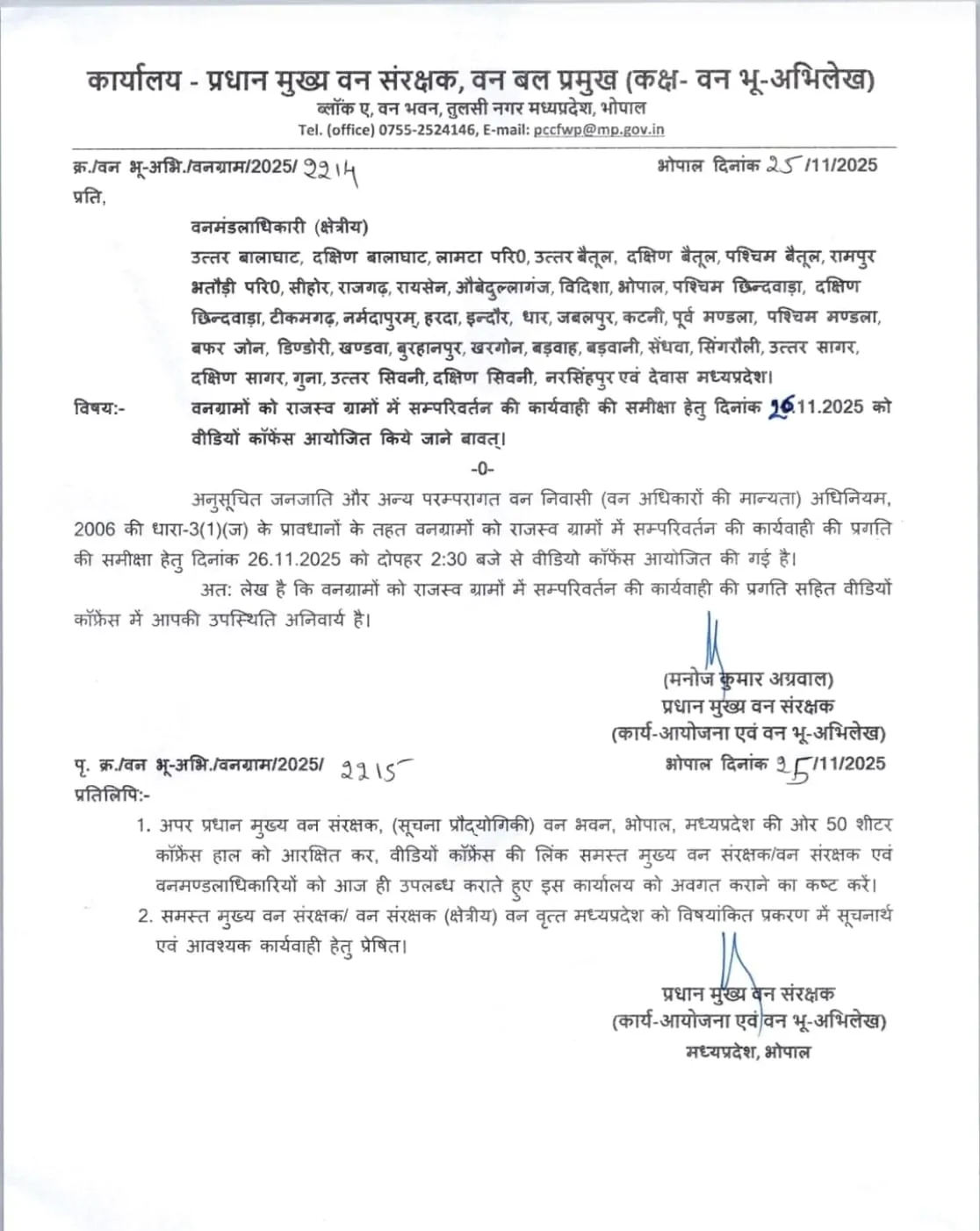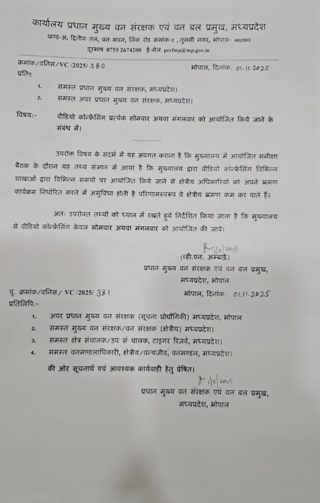 वन बल प्रमुख व्हीएन अंबाडे ने 1 नवंबर को आदेश जारी किया। आदेश में कहा गया कि अधिकारी अलग-अलग समय पर वीडियो कांफ्रेंस करते हैं। इससे मैदानी अफसरों का समय बर्बाद होता है। उन्हें फील्ड में काम करने का पर्याप्त समय नहीं मिलता। यह मैदानी निगरानी व्यवस्था में बाधक है।