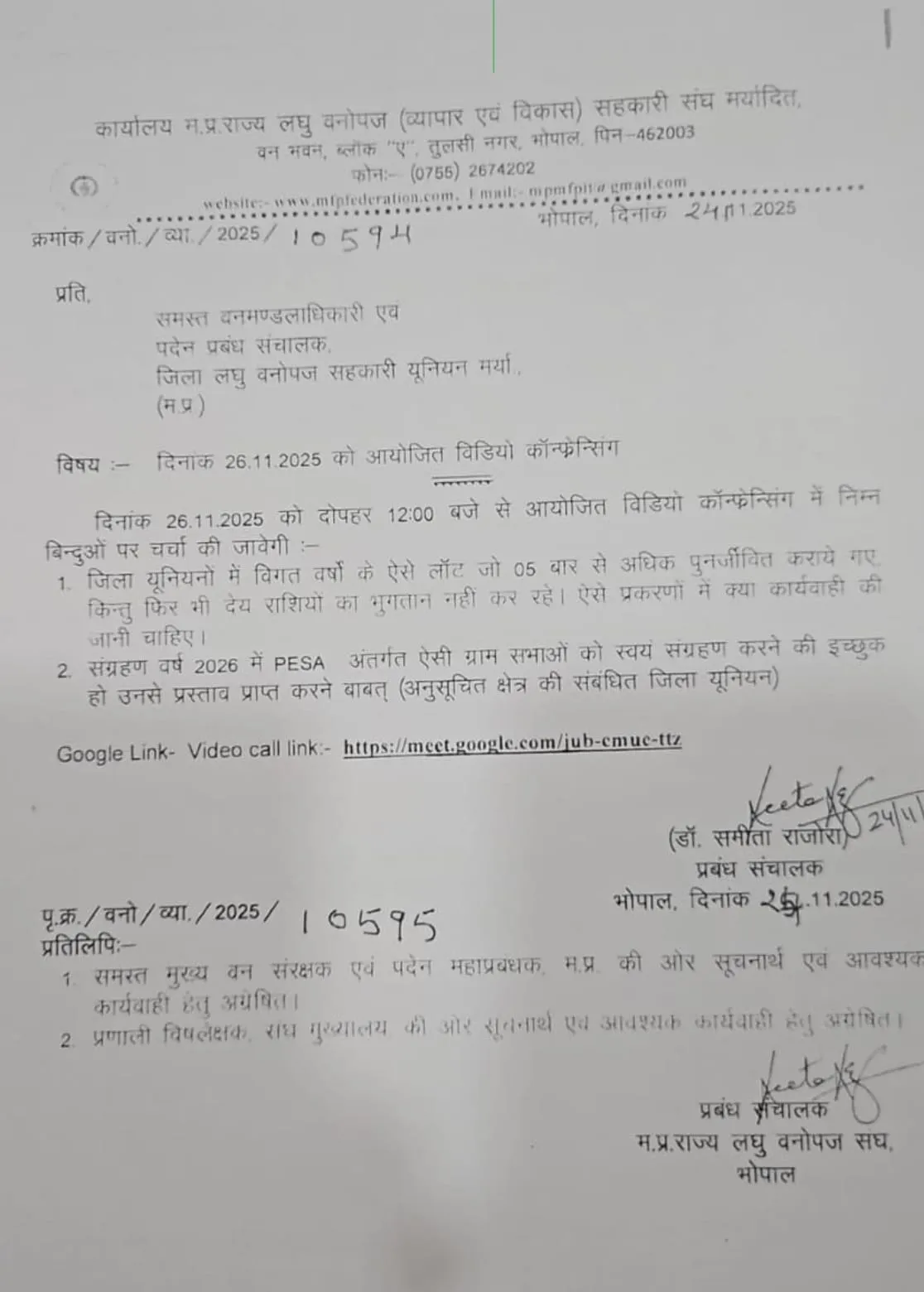 इसके बाद संघ की ही प्रबंध संचालक समिता राजौरा ने बुधवार 26 नवंबर का दिन अगली वीसी के लिए चुना। इसमें संघ की जिला यूनियन्स से लंबित वसूली व पेसा कानून से जुड़े विषय पर बात हुई। बैठक में क्षेत्रीय डीएफओ को भी जोड़ा गया।