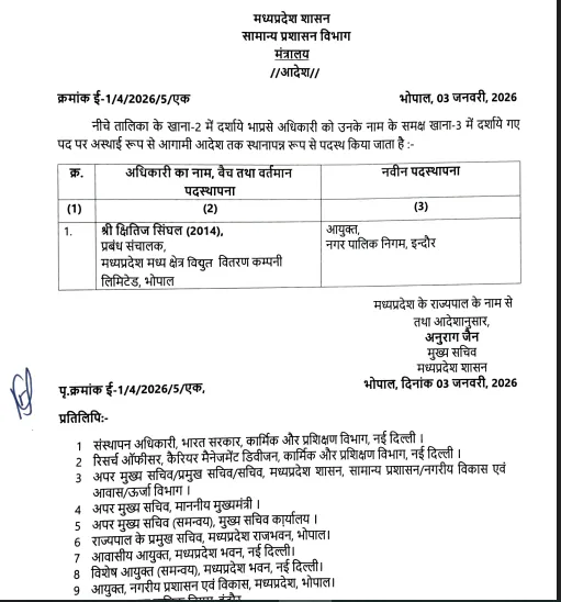 Indore News: आईएएस क्षितिज सिंघल इंदौर के नए निगमायुक्त बनाए गए हैं। इसे लेकर आदेश भी जारी हो गया है। क्षितिज पहले उज्जैन में नगर निगम कमिश्नर रह चुके हैं। इसका उन्हें फायदा मिला है।