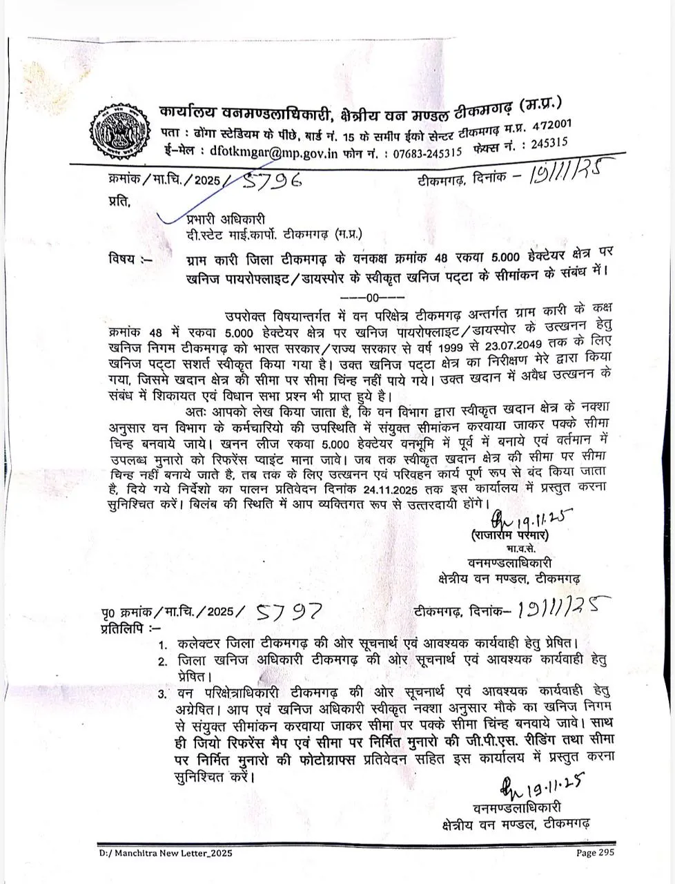 BHOPAL. टीकमगढ़ जिले के कारी वन क्षेत्र में खनन पर वन विभाग ने तत्काल प्रभाव से रोक लगा दी है। इस मामले में मध्यप्रदेश खनिज निगम के ​स्थानीय अफसरों के खिलाफ आपराधिक प्रकरण भी दर्ज किया गया है।