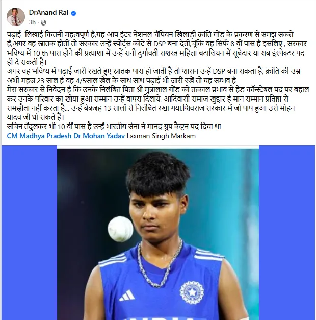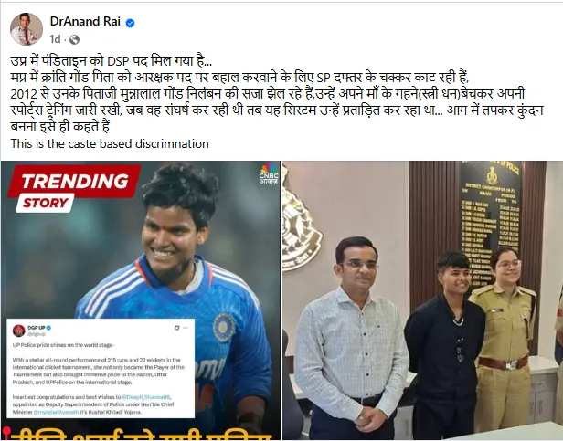 आनंद राय ने अपने एक और फेसबुक पोस्ट पर लिखा कि उत्तर प्रदेश में एक पंडिताइन को DSP का पद मिल गया है। वहीं मध्य प्रदेश में क्रांति गौड़ को अपनी मेहनत और संघर्ष के बावजूद अभी तक अपने पिता को आरक्षक पद पर बहाल करवाने के लिए SP दफ्तर के चक्कर काटने पड़ रहे हैं।