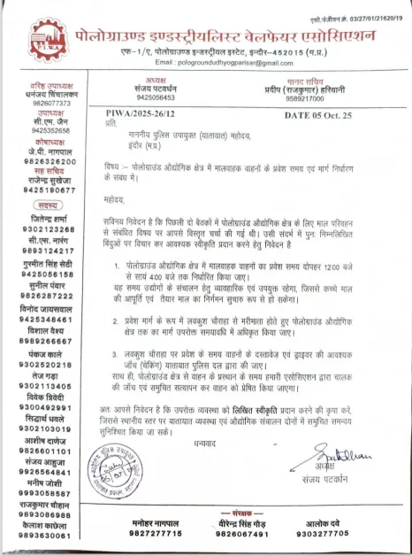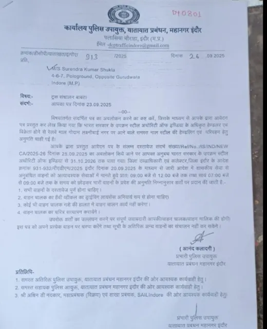 डीसीपी आनंद कलादगी के हस्ताक्षर से मेसर्स सुरेंद्र कुमार शुक्ला 4, 6, 7 पोलोग्राउंड को ट्रक संचालन के लिए स्पेशल मंजूरी दी गई है। इसमें कहा गया है कि- आपके द्वारा आवेदन किया गया है कि भारत सरकार के उपक्रम स्टील अथॉरिटी ऑफ इंडिया के अधिकृत हैंडलर व विक्रेता होने के कारण रेलवे माल गोदाम लक्ष्मीबाई नगर पर आने वाले माल स्टील की परिवहन हैंडलिंग मंजूरी चाही गई है। इंदौर कलेक्टर द्वारा 20 सितंबर को जारी आदेश से शासकीय सेवा में अनुबंधित वाहनों को आपातकालीन सेवाओं में मानते हुए, सुबह 9 से 12 बजे और शाम 7 से 9 बजे तक के समय को छोड़कर भारी वाहनों की प्रवेश मंजूरी दी जाती है।