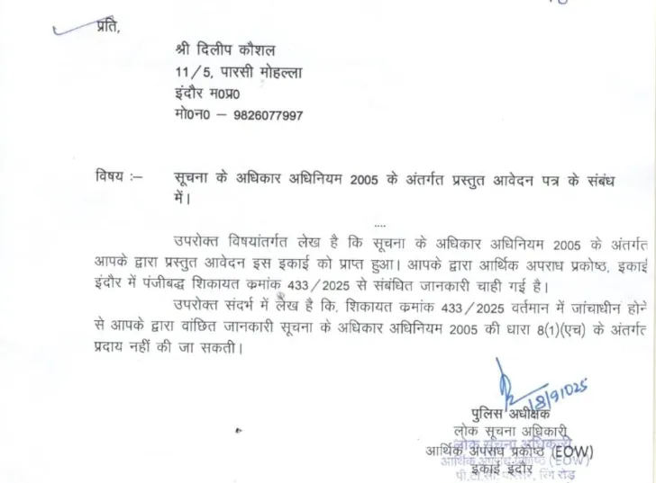 पूर्व पार्षद दिलीप कौशल ने इस मामले में शिकायत की थी। अब पुलिस अधीक्षक आर्थिक अपराध प्रकोष्ठ इंदौर द्वारा दी गई सूचना अनुसार पूर्व पार्षद कौशल की शिकायत पर संगठन द्वारा शिकायत क्रमांक 433 / 2025 पंजीबद्ध होकर जांच की जा रही है।