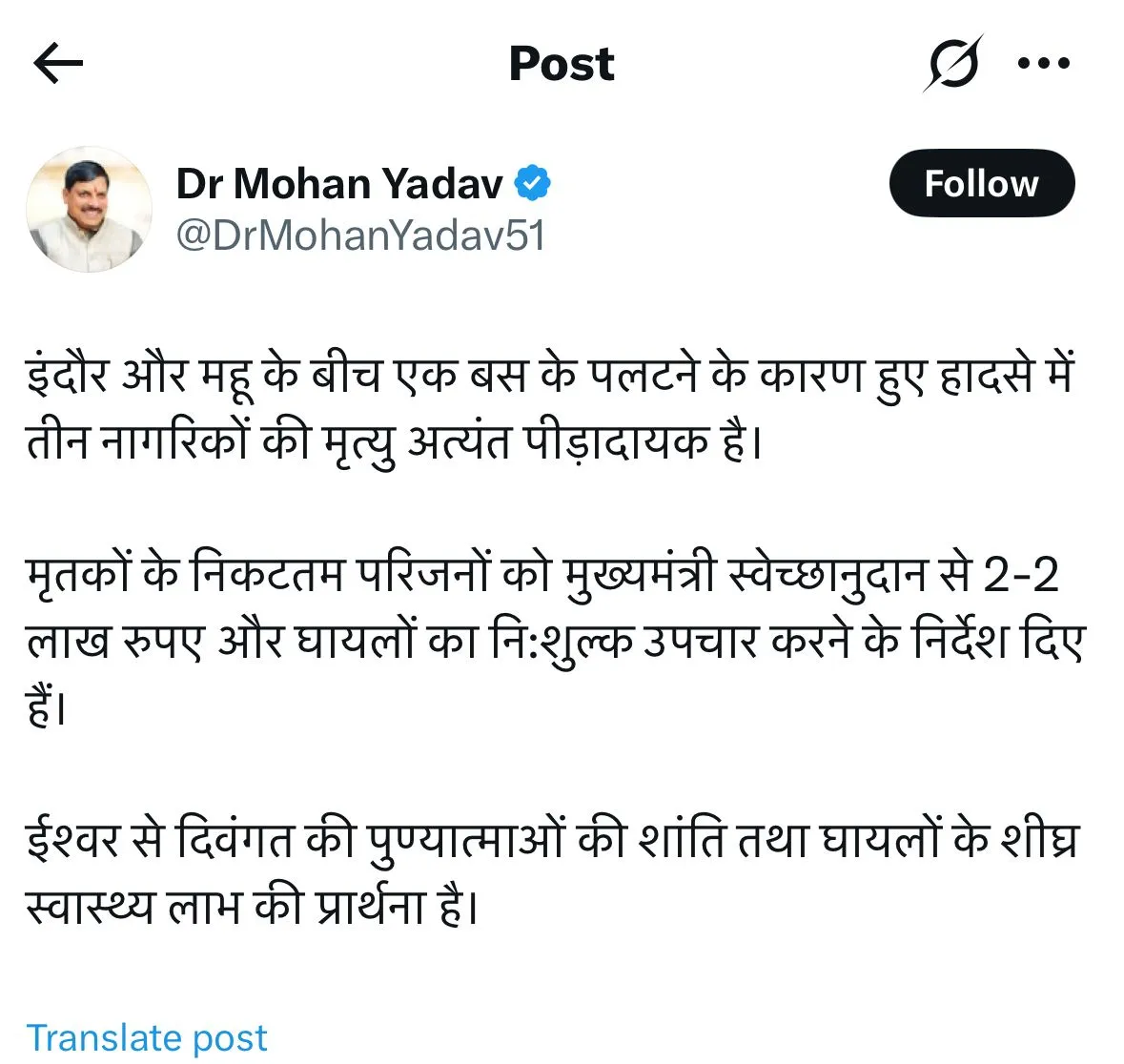 बस हादसे पर प्रदेश के मुख्यमंत्री डॉ. मोहन यादव ने भी दुख जताया। मृतकों के परिवार को स्वेच्छानुदन से 2-2 लाख रुपए देने की घोषणा की, वहीं घायलों का अस्पतालों में निःशुल्क इलाज कराने के निर्देश दिए।