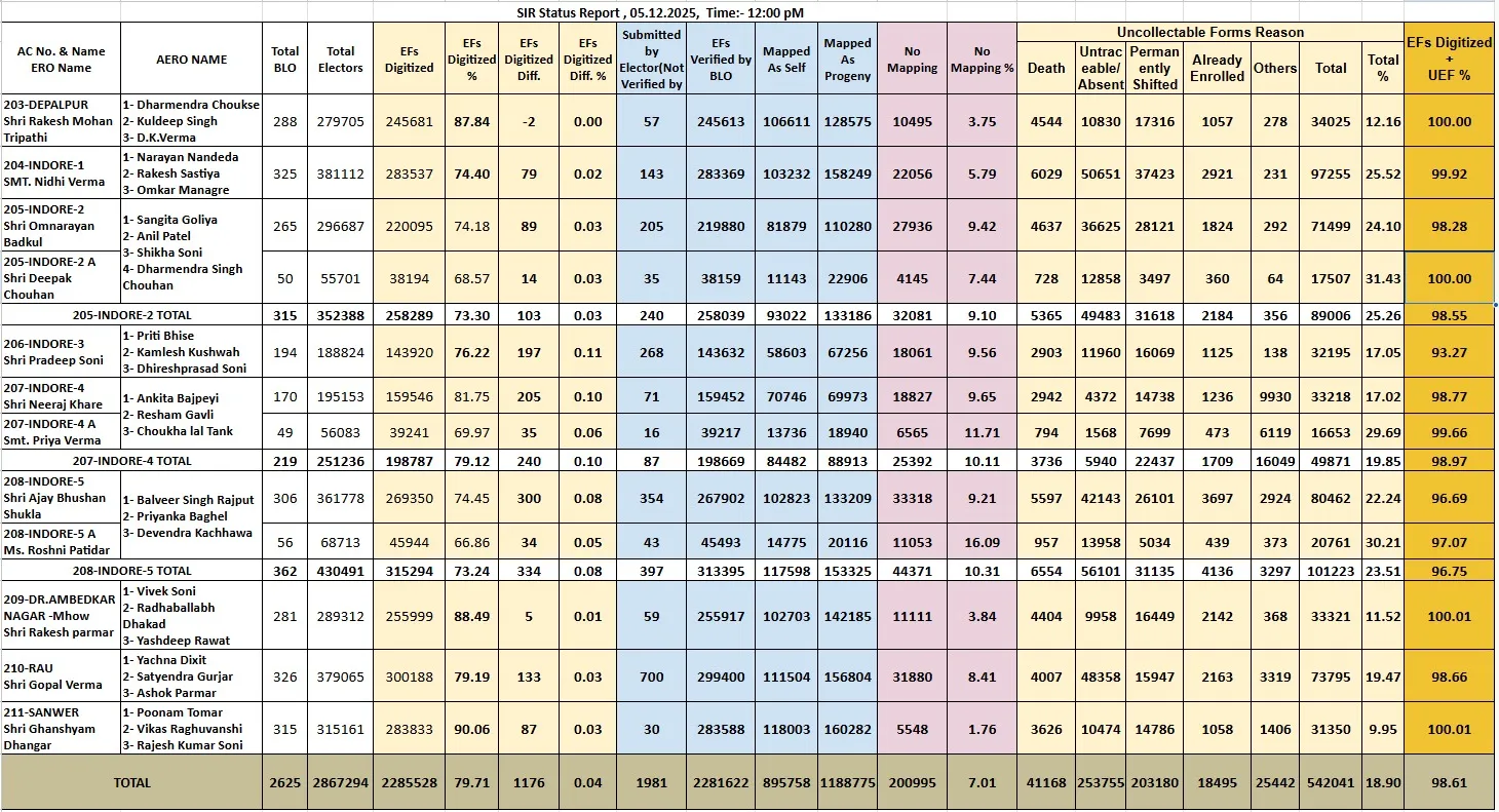 इंदौर में मतदाता सूची के विशेष गहन पुनरीक्षण (एसआईआर) का काम 98.61 प्रतिशत हो चुका है। यह शुक्रवार, 05 दिसंबर की रात तक सौ प्रतिशत हो जाएगा। जिले के कुल 28.67 लाख मतदाताओं में से 22.28 लाख तो मिल गए हैं।