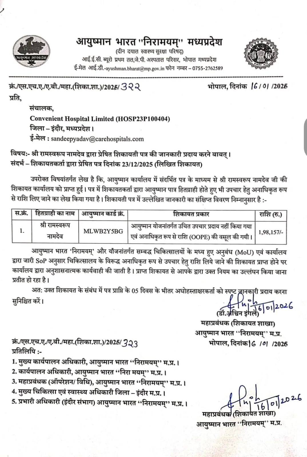 INDORE. इंदौर के बड़े निजी अस्पतालों में शामिल केयर सीएचएल (Convenient Hospital Limited) ने एक बार फिर आयुष्मान मरीजों के साथ धोखाधड़ी की है।