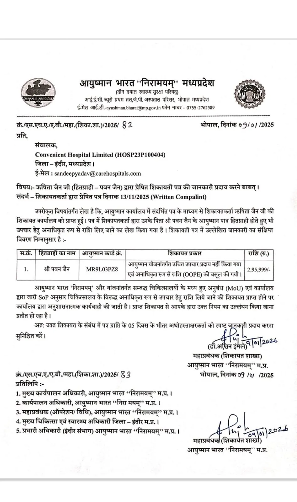 भोपाल स्थित आयुष्मान भारत निरामयम ने अस्पताल प्रबंधन को नोटिस जारी किया है।