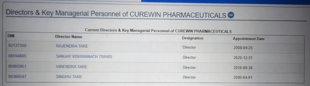 इस कंपनी में रजिस्ट्रार ऑफ कंपनी के अनुसार डायरेक्टर राजेंद्र तारे, संजय विश्वनाथ तिवारी, वीरेंद्र तारे और सिंधु तारे हैं। कंपनी रंगवासा, राउ इंदौर में स्थित है और फार्मा सेक्टर में सक्रिय है।