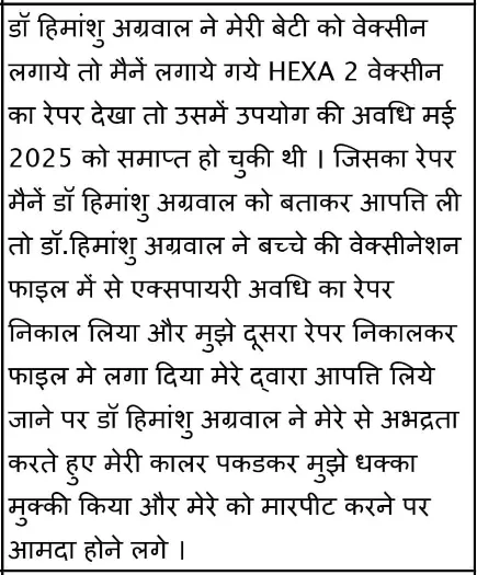 राहुल ठाकुर ने एफआईआर में कहा गया है कि डॉ. हिमांशु अग्रवाल ने मेरी बेटी को वैक्सीन लगाई। जब मैंने उस हेक्सा 2 (Hexa-2) वैक्सीन के रैपर को देखा, तो उसकी एक्सपायरी डेट मई 2025 में खत्म हो चुकी थी।