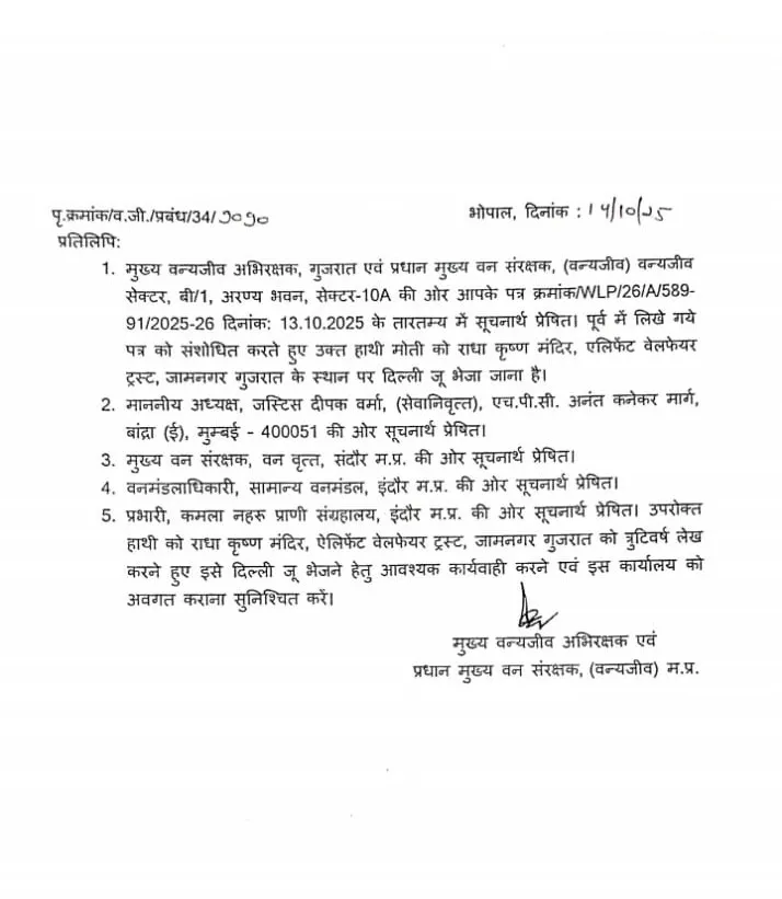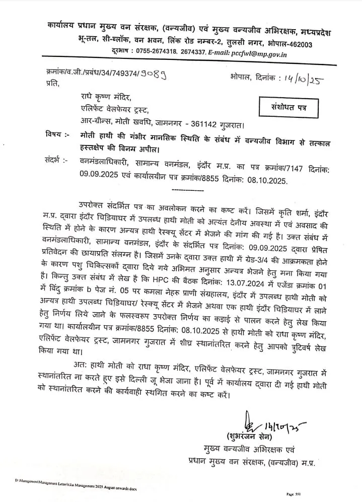 मध्य प्रदेश शासन के चीफ वाइल्ड लाइफ वार्डन की ओर से आए पत्र में कहा गया है कि इंदौर जू में मौजूद हाथी मोती फिलहाल वहीं रहेगा। उसके स्वास्थ्य और आयु को देखते हुए ट्रांसफर उचित नहीं है। पत्र में आगे कहा गया कि मोती के अकेलेपन को दूर करने के लिए एक फीमेल हाथी की व्यवस्था की जाएगी, ताकि उसका मानसिक संतुलन बना रहे।