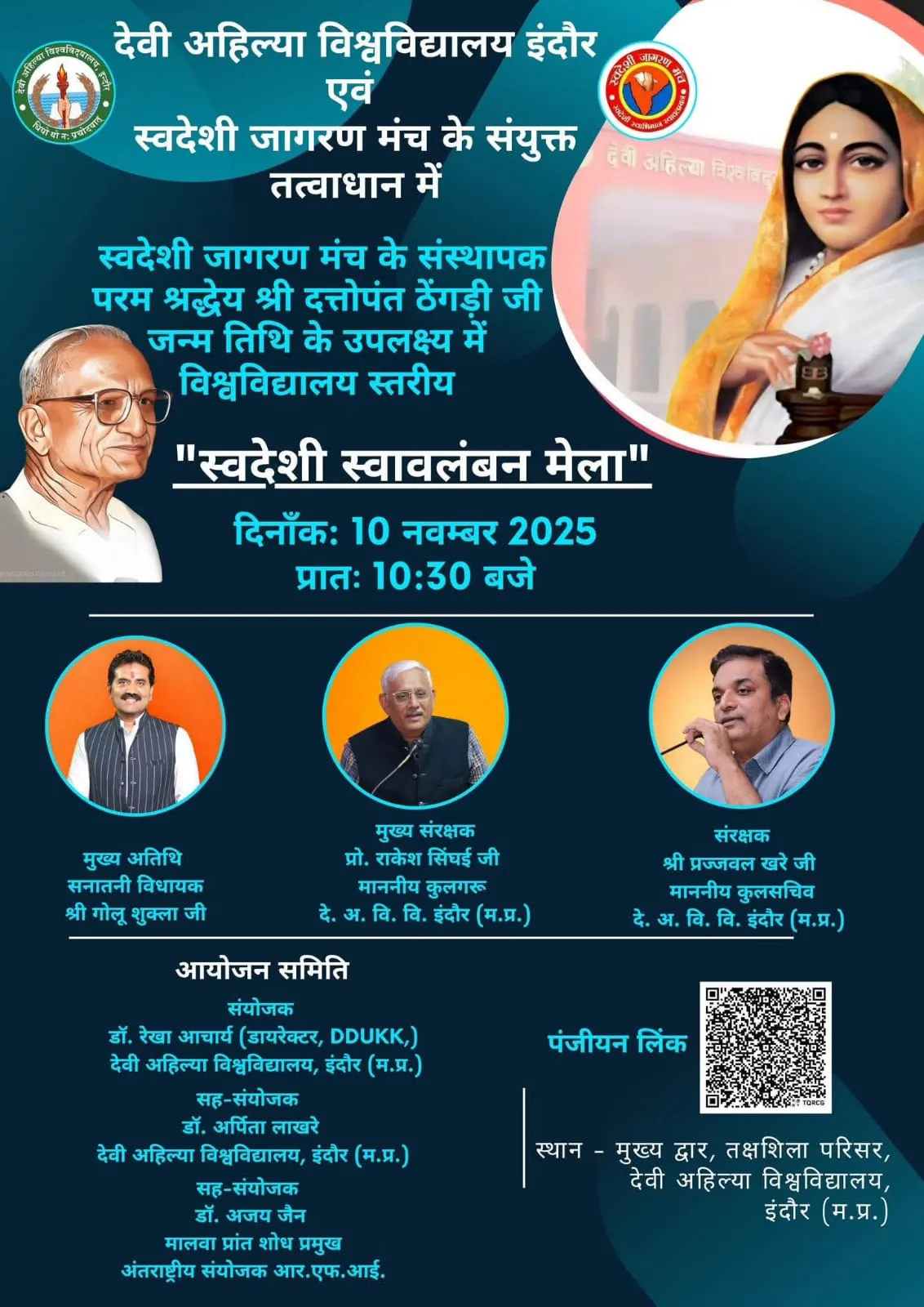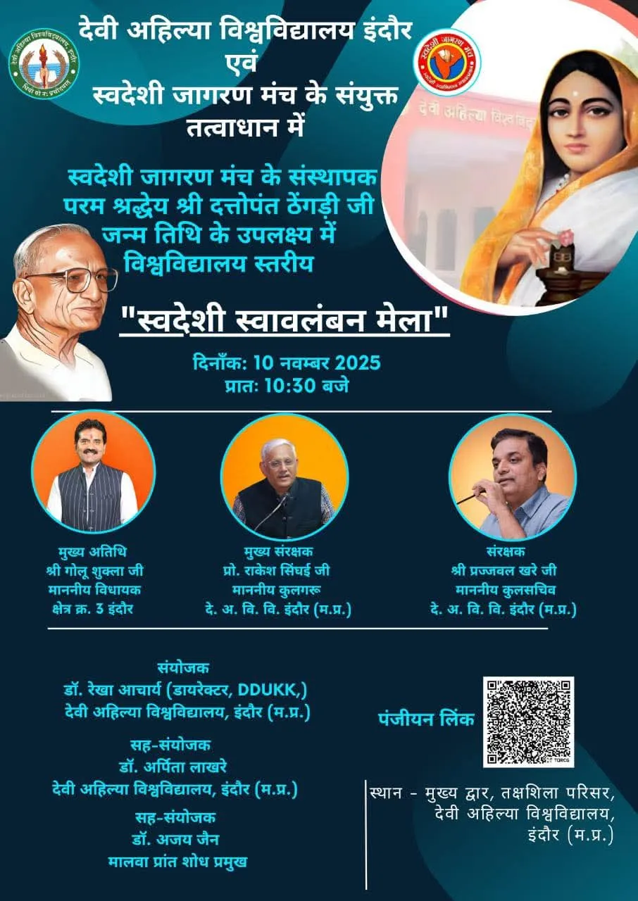 देवी अहिल्या विश्वविद्यालय के जरिए 10 नवंबर को स्वदेशी स्वावलंबन मेला आयोजित किया जा रहा है। यह आयोजन स्वदेशी जागरण मंच के साथ किया जाएगा। इस आयोजन के आमंत्रण पत्र में पहले मुख्य अतिथि के तौर पर विधायक गोलू शुक्ला का नाम लिखा था।