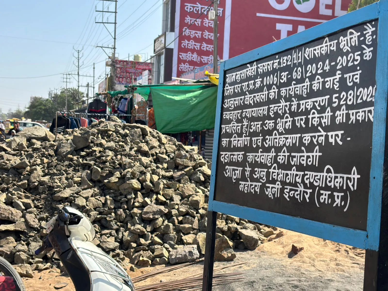 यहां बिना अनुमति और बिना भवन नक्शा पास कराए ही दुकानें-बिल्डिंगें तैयार हो गईं। इस मामले में पटवारी रजनी ने बताया कि उन्हें एसडीएम का आदेश था कि बोर्ड लगाकर आना है। उन्होंने कहा, मैं बोर्ड लगाकर आ गई।