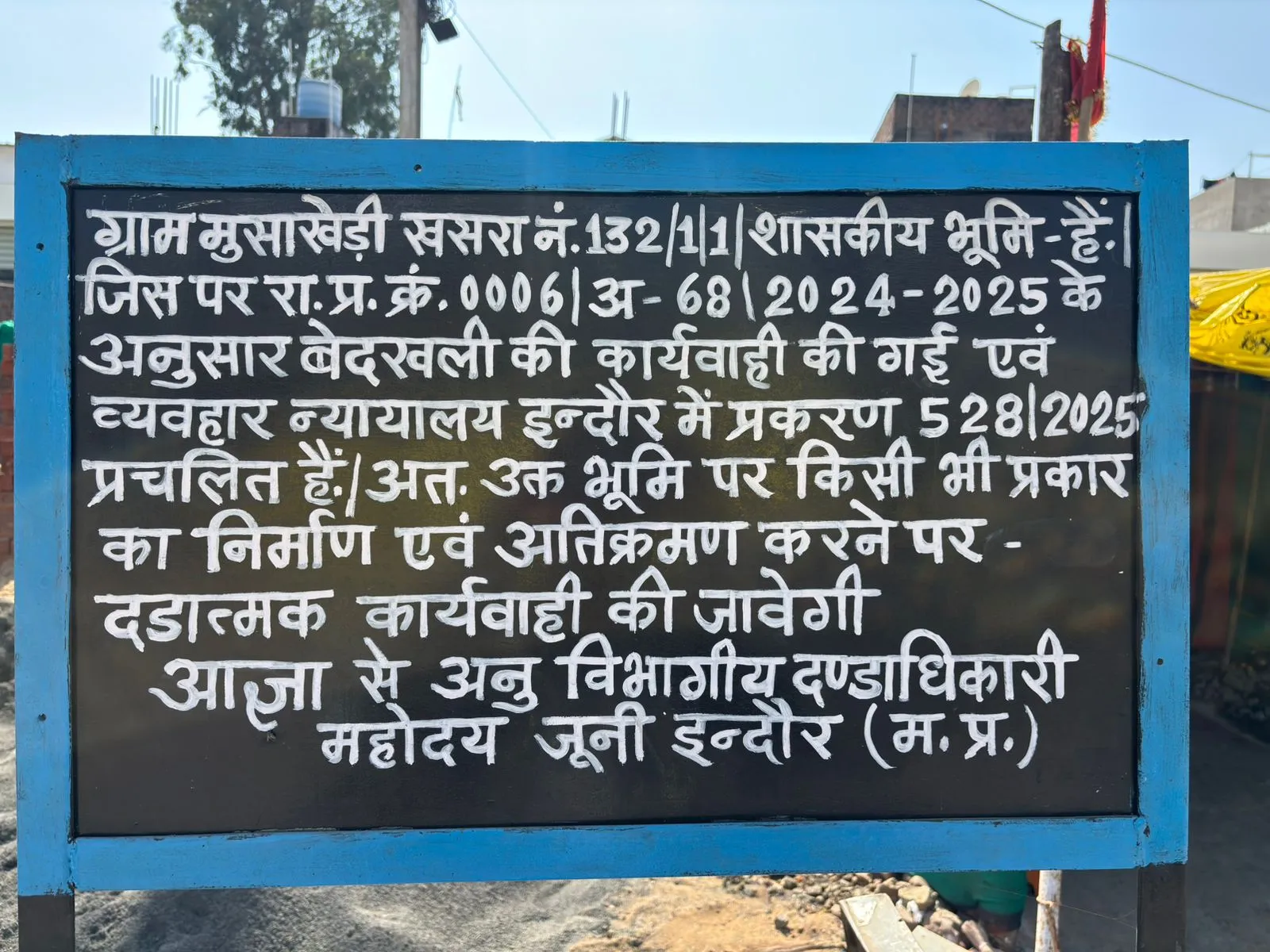 मूसाखेड़ी पटवारी रजनी टीम के साथ मौके पर पहुंची थी। निर्माण रुकवाने के बजाय उन्होंने सिर्फ एक बोर्ड लगाकर खानापूर्ति कर दी। बोर्ड पर लिखा गया यह भूमि शासकीय है, इस पर अतिक्रमण करना दंडनीय अपराध है। खास बात यह है कि जो बोर्ड लगा है उसके पीछे ही निर्माण चल रहा है। अतिक्रमण करने वालों को न तो रोका गया और न ही उनके खिलाफ कोई कार्रवाई की गई।
