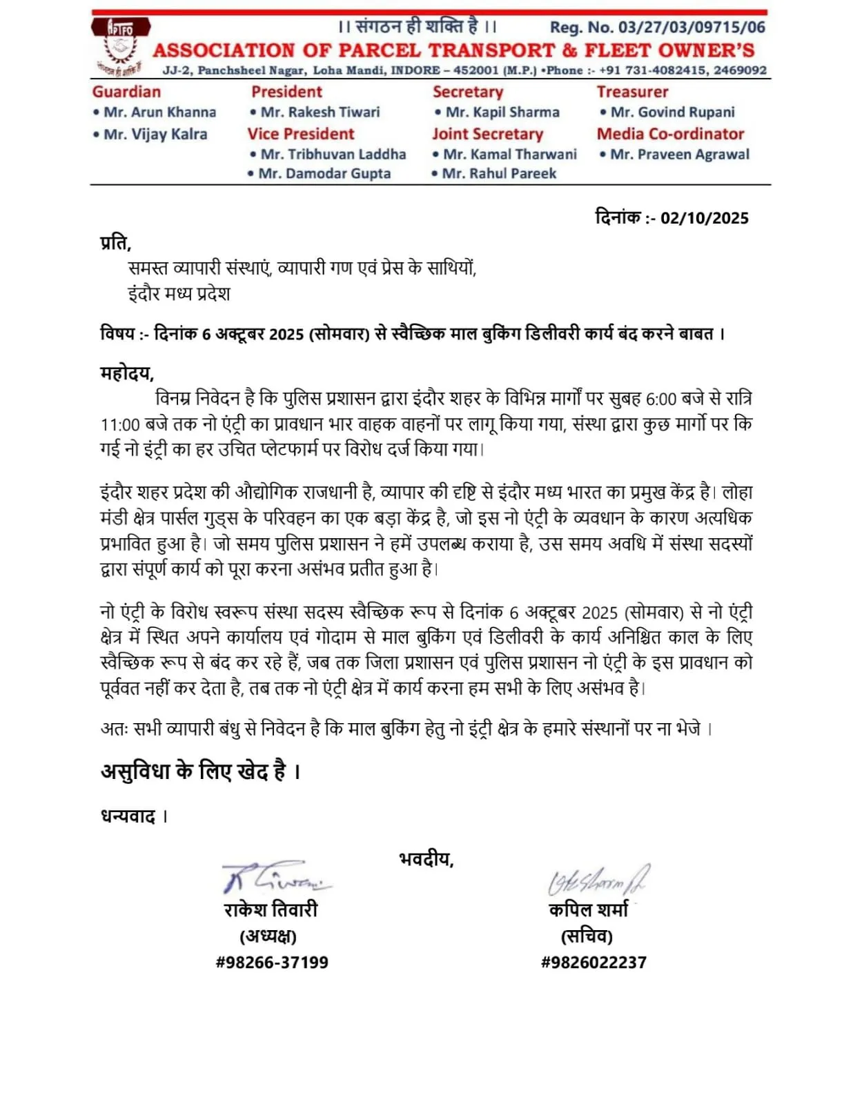 इंदौर में नो एंट्री के विरोध स्वरूप संस्था के सदस्य स्वैच्छिक रूप से 6 अक्टूबर सोमवार से अपने कार्यालय/गोदाम से माल बुकिंग और डिलीवरी के काम अनिश्चितकाल के लिए बंद करेंगे। जब तक प्रशासन और पुलिस इस एंट्री के प्रावधान को पूर्ववत नहीं करते हैं। नो एंट्री के प्रावधान के तहत काम करना असंभव है। असुविधा के लिए खेद है।
