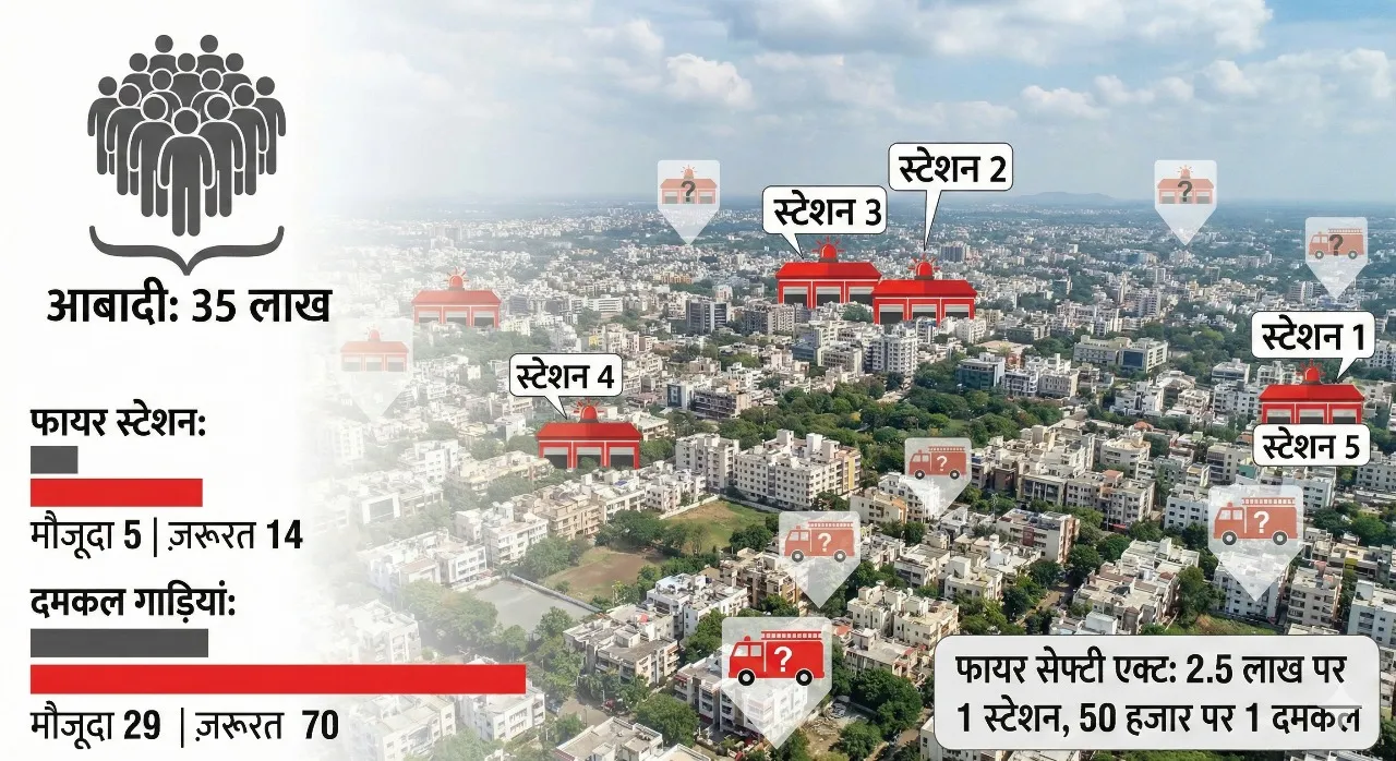 फायर सेफ्टी एक्ट के तहत ढाई लाख की आबादी पर एक स्टेशन होना चाहिए। शहर में करीब 35 लाख की आबादी पर सिर्फ 5 स्टेशन हैं। 50 हजार की आबादी पर 1 दमकल होना चाहिए। यानी 35 लाख की आबादी पर करीब 70 दमकल चाहिए, लेकिन फिलहाल केवल 29 हैं।