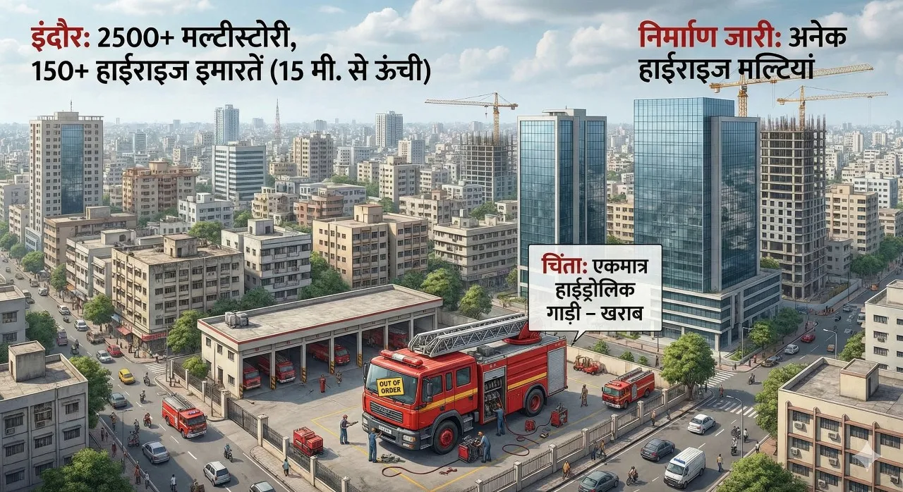 इंदौर में 2500 से ज्यादा मल्टीस्टोरी हैं। इनमें 150 से ज्यादा हाईराइज इमारतें हैं, जो 15 मीटर से ऊंची हैं। वहीं अनेक हाईराइज मल्टियों का निर्माण चल रहा है। चिंता की बात यह है कि हाईराइज इमारतों में आग बुझाने के लिए फायर ब्रिगेड के पास केवल एक हाईड्रोलिक गाड़ी है। वह भी खराब है।
