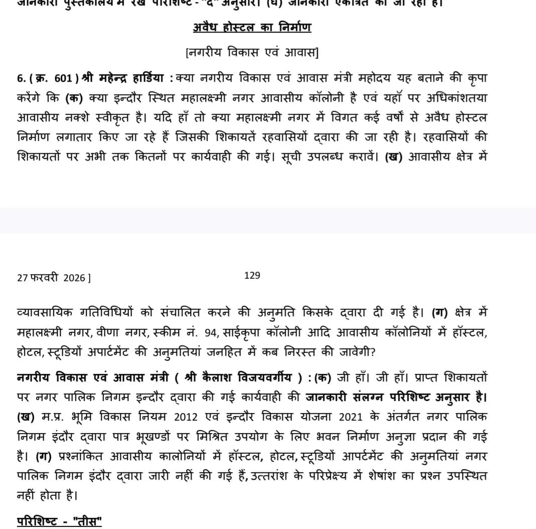 विधायक हार्डिया- क्या इंदौर स्थित महालक्ष्मीनगर आवासीय कॉलोनी है और यहां का नक्शा आवासीय मंजूर है? हां तो अवैध हॉस्टल में बीते सालों से निर्माण हो रहे हैं। रहवासियों द्वारा शिकायतें की जा रही लेकिन कितनों पर कार्रवाई हुई।