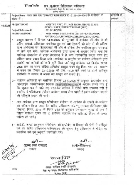 उधर प्रोजेक्ट का रेरा पंजीयन नहीं होने के बाद भी प्रोजेक्ट के ब्रोशर छप चुके हैं और बुकिंग ली जा रही है। वहीं बिना पर्यावरण मंजूरी के ही काम शुरू होने पर सिया (SEIAA) ने 18 सितंबर 2025 को कलेक्टर इंदौर को बिना पर्यावरण प्राधिकरण से मंजूरी लिए आदेश पत्र पारित किया था। यह पत्र गैरकानूनी तरीके से निर्माण कार्य करने के बाबत जांच कर और तत्काल रिपोर्ट SEIAA प्राधिकरण भोपाल भेजने के लिए पारित किया था।