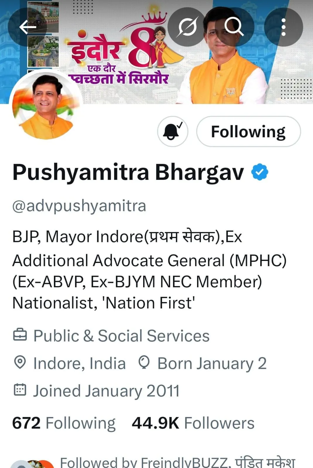 इंदौर महापौर पुष्यमित्र भार्गव- 44.9 हजार फॉलोअर्स