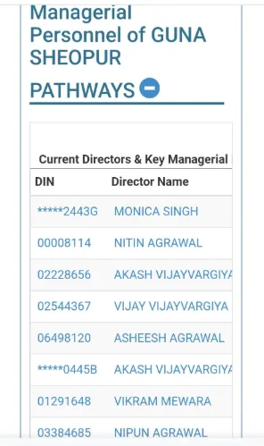 पाथ ग्रुप में नितिन अग्रवाल एमडी हैं, निपुन अग्रवाल, सक्षम अग्रवाल, नीति अग्रवाल, संतोष अग्रवाल डायरेक्टर पद पर हैं। साथ ही, आशीष अग्रवाल और आदित्य उपाध्याय इंडिपेंडेंट डायरेक्टर हैं। यह देश भर में टोल, हाईवे निर्माण और अन्य कंस्ट्रक्शन कामों में जुड़ा हुआ है। ग्रुप की दर्जन भर से ज्यादा अलग-अलग कंपनियां विभिन्न प्रोजेक्ट्स के लिए बनी हैं। इसमें एक कंपनी गुना-श्योपुर पाथवेस प्रालि भी है। इसमें मंत्री कैलाश विजयवर्गीय के पुत्र और पूर्व विधायक आकाश विजयवर्गीय 30 सितंबर 2017 से डायरेक्टर पद पर हैं। इसके साथ ही उनके चाचा और मंत्री के भाई विजयवर्गीय नॉमिनी डायरेक्टर पद पर हैं। इनके साथ ही मोनिका सिंह, नितिन अग्रवाल, आशीष अग्रवाल, विक्रम मेवारा, निपुन अग्रवाल और अतुल शाह भी हैं।