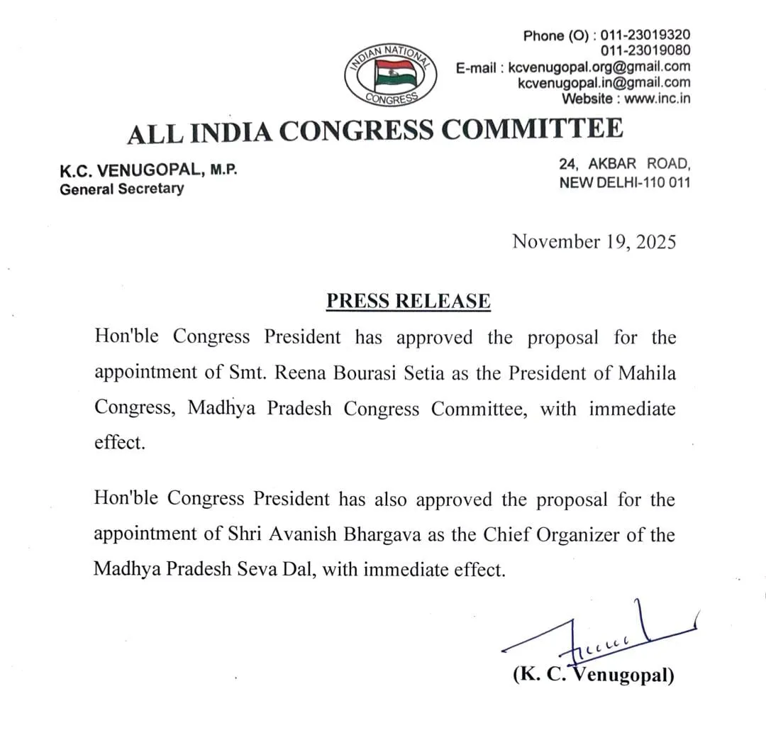 इसके साथ ही कांग्रेस ने सेवा दल मप्र के चीफ आर्गेनाइजर के तौर पर अविनाश भार्गव की नियुक्ति की है। उनका इस पद पर आना पहले से तय था और इस नियुक्ति ने किसी को नहीं चौंकाया है।