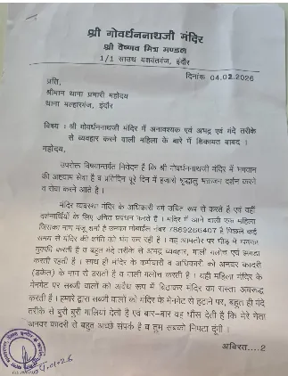 इंदौर के प्रसिद्ध गोवर्धन नाथ मंदिर प्रबंधन ने पुलिस कमिश्नर और मल्हारगंज थाना प्रभारी से शिकायत की है। इसमें कहा गया है कि श्री गोवर्धन नाथ मंदिर में एक महिला के जरिए अभद्र व्यवहार, गाली-गलौज और झगड़े किए जा रहे हैं।