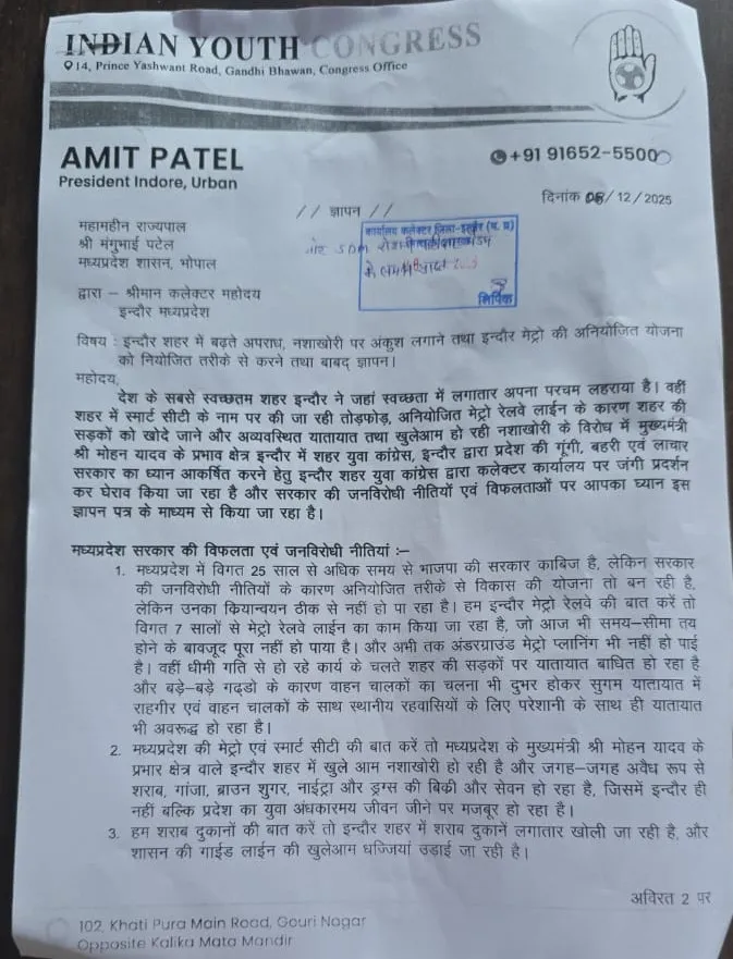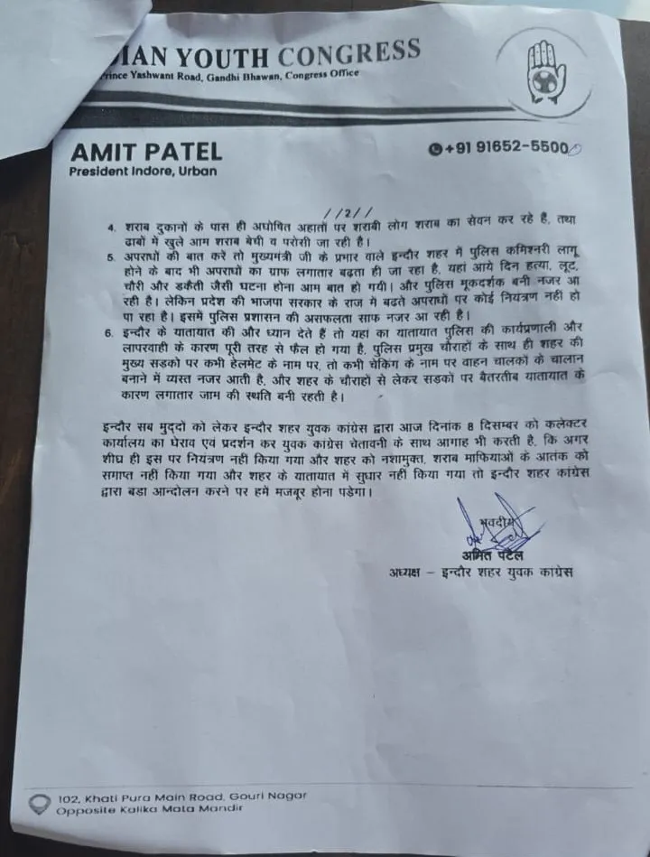 युवक कांग्रेस अध्यक्ष अमित पटेल ने कहा, इंदौर में चोरी-लूट बढ़ रही है। महिलाओं की सुरक्षा पर सवाल खड़े हो रहे हैं। नशा माफिया सक्रिय है। युवाओं में नशे की लत बढ़ रही है। प्रशासन इन मुद्दों पर असफल रहा है। हमारी मांग है कि नशा मुक्त इंदौर अभियान चलाया जाए, नशा माफिया पर कड़ी कार्रवाई हो।