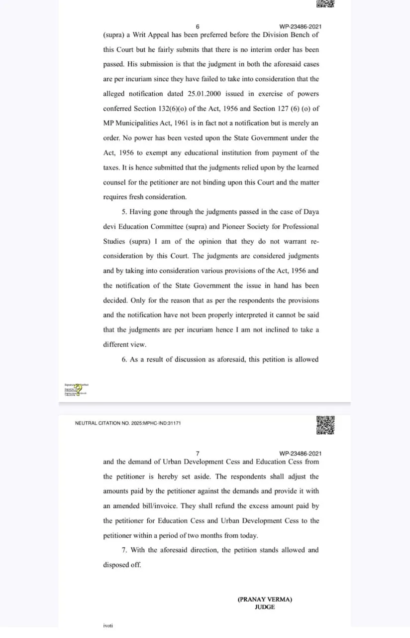 आदेश में कहा गया है कि याचिकाकर्ता (स्कूल प्रबंधन) से शहरी विकास उपकर और शिक्षा उपकर की मांग को एतद्द्वारा निरस्त किया जाता है। प्रतिवादी यानी नगर निगम, याचिकाकर्ता द्वारा भुगतान की गई राशि को मांगों के विरुद्ध समायोजित करें।