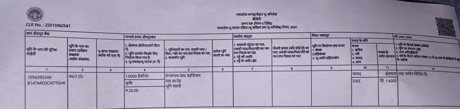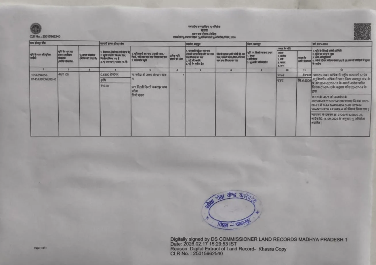 उत्तम स्वामी के आश्रम से जुड़ी जमीन के मामले में, जबलपुर लोक सूचना के द्वारा 17 फरवरी को जारी खसरे की प्रति में स्पष्ट रूप से दर्शाया गया है कि संबंधित भूमि कृषि मद में दर्ज है। कॉलम नंबर 10 में जायद फसल के रूप में उड़द की खेती का उल्लेख आज भी दर्ज है। इसके बावजूद उसी भूमि पर पक्का आश्रम संचालित हो रहा है और हाल के महीनों में निर्माण विस्तार की भी जानकारी सामने आई है।
