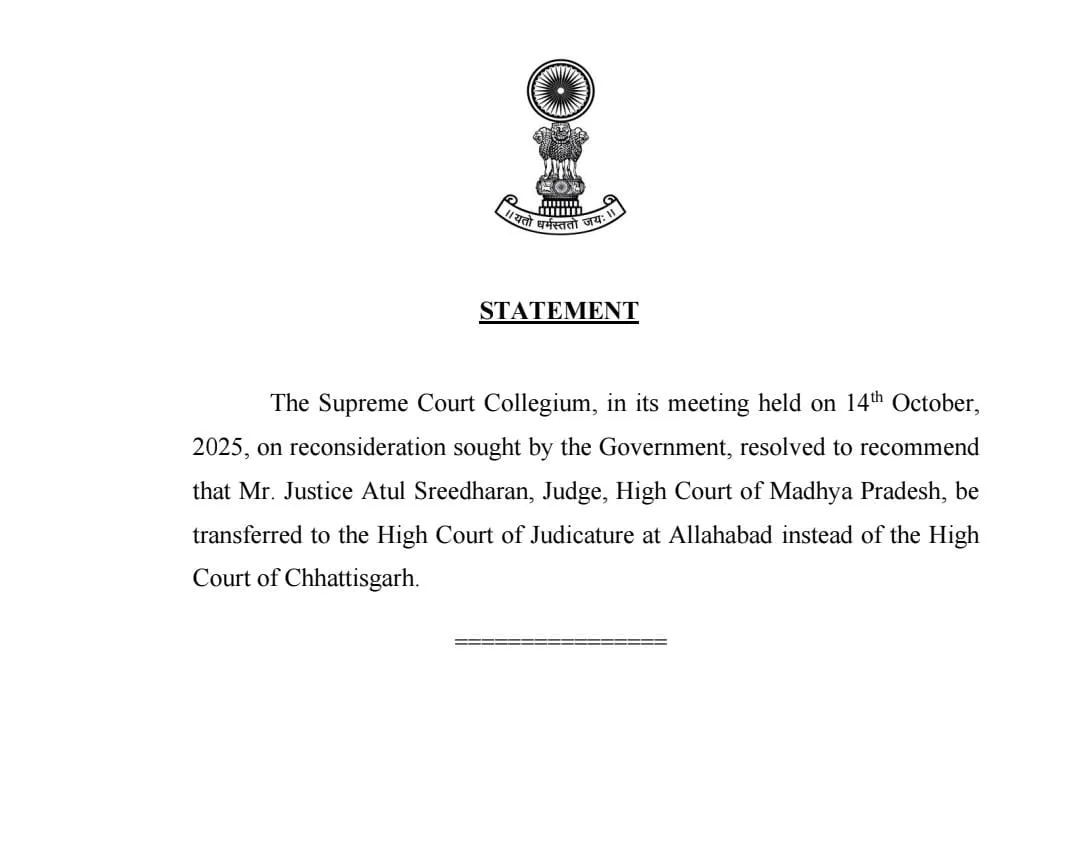 25 अगस्त 2025 को सुप्रीम कोर्ट कॉलेजियम ने जस्टिस अतुल श्रीधरन को एमपी हाईकोर्ट से छत्तीसगढ़ हाईकोर्ट में ट्रांसफर करने की सिफारिश की थी। लेकिन केंद्र सरकार ने इस फैसले पर आपत्ति जताते हुए पुनर्विचार का आग्रह किया।