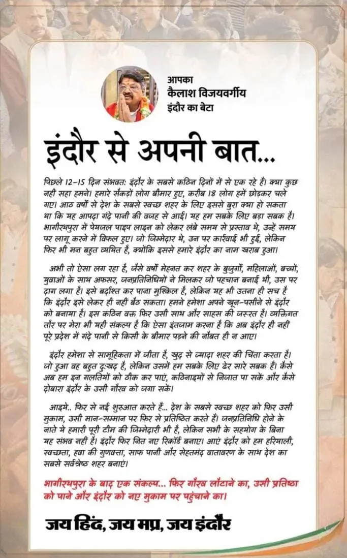 आइये.. फिर से नई शुरुआत करते हैं... देश के सबसे स्वच्छ शहर को फिर उसी मुकाम, उसी मान-सम्मान पर फिर से प्रतिष्ठित करते हैं।… भागीरथपुरा के बाद एक संकल्प... फिर गांव लौटाने का, उसी प्रतिष्ठा को पाने और इंदौर को नए मुकाम पर पहुंचाने का।