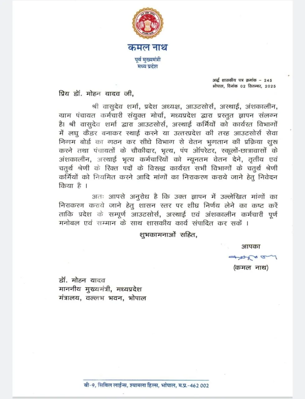 BHOPAL. आउटसोर्स कर्मचारियों के राजधानी में हल्लाबोल आंदोलन की तैयारी के बीच पूर्व मुख्यमंत्री कमलनाथ उनके पक्ष में आ गए हैं। 7 सितम्बर को भोपाल में प्रदर्शन प्रस्तावित है। कमलनाथ ने आउटसोर्स कर्मचारियों के शोषण पत्र चिंता जताई है और उनके भविष्य को सुरक्षित करने के लिए मुख्यमंत्री डॉ.मोहन यादव से लघु कैडर बनाने की मांग की है।