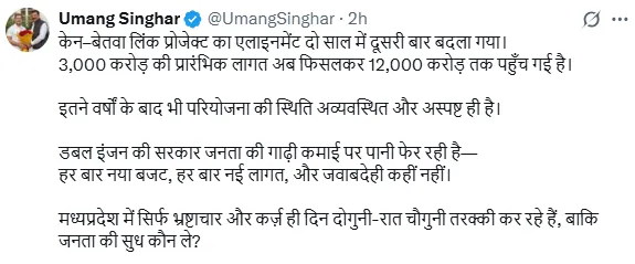 कुल लागत 44 हजार 605 करोड़ है। इससे मध्यप्रदेश के 44 लाख लोगों और उत्तरप्रदेश के 21 लाख लोगों को पानी मिलेगा। दो हजार गांव के सात लाख से ज्यादा किसान लाभ पाएंगे। लेकिन बंगले और कॉलोनी बचाने से आम लोगों का हित प्रभावित हो सकता है।