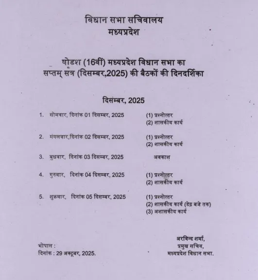 मध्यप्रदेश विधानसभा के सचिवालय ने बुधवार को 16वीं विधानसभा के सातवें शीतकालीन सत्र की तारीखों का ऐलान कर दिया है। यह सत्र दिसंबर 2025 में होने जा रहा है और ये पांच दिन तक चलेगा।