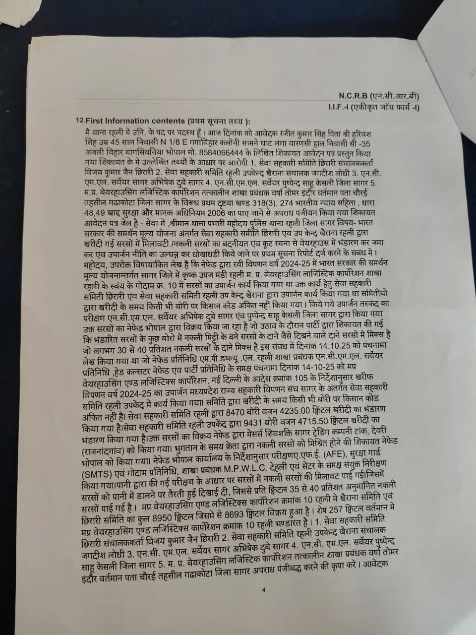 नेफेड यानी नेशनल एग्रीकल्चरल कोऑपरेटिव मार्केटिंग फेडरेशन ऑफ इंडिया के लिए 2024-25 में एमपी मार्कफेड ने सरसों की खरीदी की थी। रहली की सहकारी समिति छिरारी और उपकेंद्र खैराना पर 8950 क्विटंल सरसों समर्थन मूल्य योजना के तहत खरीदा गया। रहली के गोदाम में रखे सरसों को नेफेड ने राजनांदगांव की फर्म मेसर्स शिवशक्ति सागर ट्रेडिंग कंपनी को नीलाम किया था। जब सरसों कंपनी के पास पहुंची तो फर्जीवाड़ा सामने आ गया।