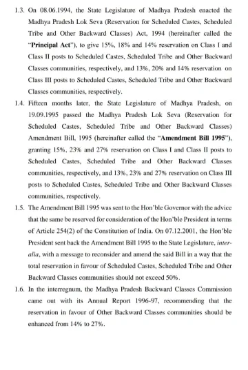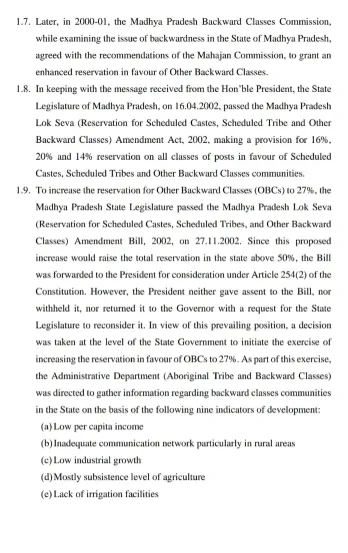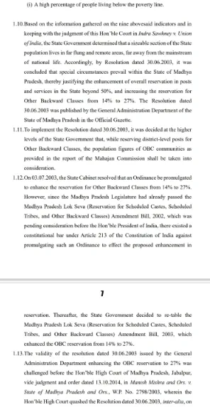 इंदिरा साहनी केस में 1992 में आरक्षण की अधिकतम सीमा 50 फीसदी तय कर दी गई। लेकिन साथ ही कहा कि असाधारण स्थितियों में इसे बढ़ाया जा सकता है। मप्र द्वारा 15 हजार पन्नों में अभी तक के विविध आयोग के प्रतिवेदन, रिपोर्ट पेश की गई है। इसमें महाजन रिपोर्ट के साथ ही राज्य पिछड़ा वर्ग की अलग-अलग रिपोर्ट है।