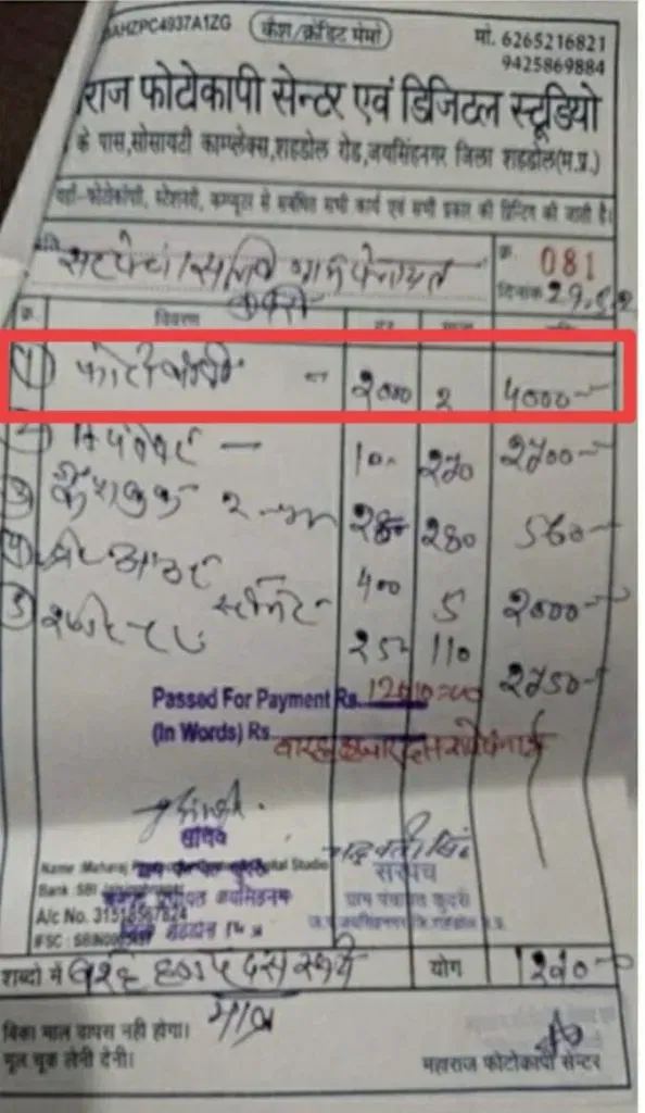 मध्य प्रदेश के शहडोल जिले से एक और सरकारी राशि में हेराफेरी का मामला सामने आया है, जिसने सभी को चौंका दिया है। जयसिंह नगर जनपद पंचायत के तहत कुदरी ग्राम पंचायत में एक बिल पास किया गया। इसमें केवल दो पन्नों की फोटोकॉपी के लिए 4000 रुपए का भुगतान किया गया। यह बिल अब चर्चा का विषय बन गया है।