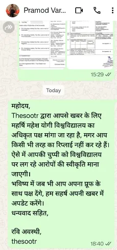 इन सभी मुद्दों पर शिक्षण संस्थान का पक्ष जानने के लिए द सूत्र ने विवि के कुलगुरु डॉ. प्रमोद वर्मा से कई बार संपर्क किया गया। यहां तक कि व्हाट्सएप पर दो बार मेसेज भी भेजे गए, लेकिन कुलगुरु इन सब मामलों में चुप्पी साध गए।