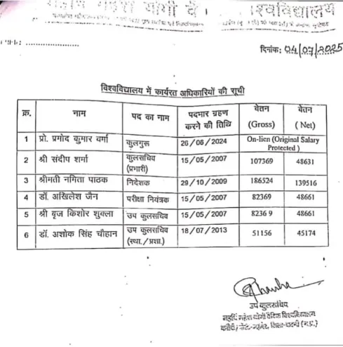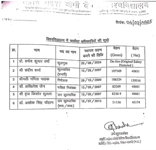 महर्षि महेश योगी वैदिक विवि में कुल सचिव यानी रजिस्ट्रार का पद भी सवालों के घेरे में है। विवि ने जो जानकारी आयोग को भेजी, वो रजिस्ट्रार संदीप शर्मा के हस्ताक्षर से भेजी गई है।