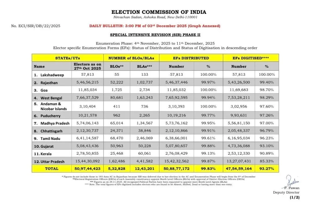 चुनाव आयोग के बुधवार को जारी आंकड़ों के अनुसार 12 राज्यों में 93.27 फीसदी काम पूरा हो चुका है। यहां के 50.97 करोड़ मदताताओं में से 47.65 करोड़ मतदाताओं के फार्म डिजिटलाइज हो चुके हैं। पश्चिम बंगाल में 98.29 फीसदी काम हो चुका है। वह 12 राज्यों में चौथे पायदान पर है। वहीं गुजरात में 93.10 फीसदी काम हुआ है और वह 10वें पायदान पर है।