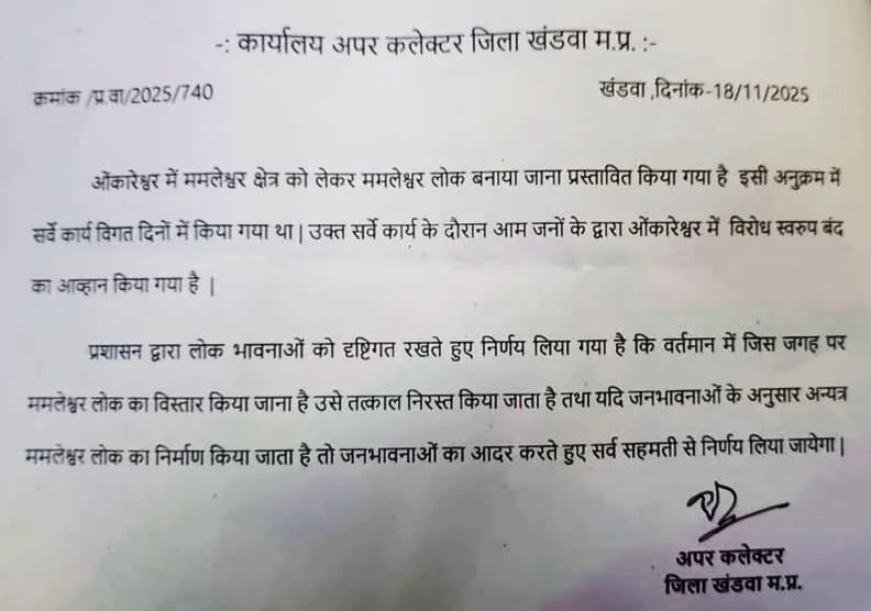 INDORE/KHANDWA. मध्यप्रदेश के ओंकारेश्वर में ममलेश्वर लोक परियोजना को लेकर पिछले कई दिनों से विवाद और विरोध जारी है। इसी बीच सरकार ने बड़ा निर्णय लेते हुए मंगलवार को परियोजना पर फिलहाल रोक लगाने का आदेश जारी कर दिया है। नगर के रहवासी, व्यापारी, साधु-संत और स्थानीय संगठनों के व्यापक आंदोलन को देखते हुए प्रशासन ने यह कदम उठाया है।