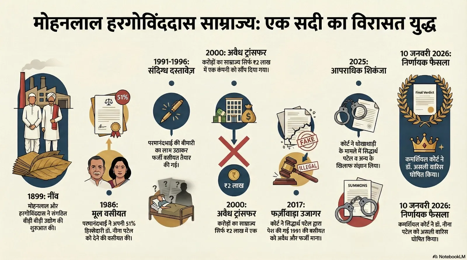 10 जनवरी 2026: निर्णायक फैसला - कमर्शियल कोर्ट ने डॉ. नीना पटेल को असली वारिस माना और अवैध कब्जों को खारिज कर दिया।