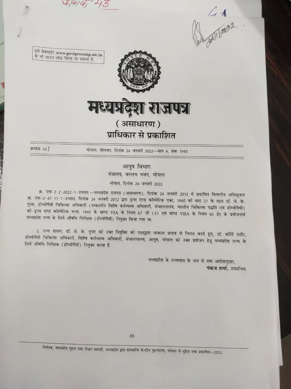 BHOPAL. आयुष विभाग की महिला चिकित्सा अधिकारी होम्योपैथी की दोहरी नियुक्ति समाप्त कर दी गई है। द सूत्र ने आयुष विभाग की इस गड़बड़ी को उजागर किया था। इसके बाद सरकार ने यह कदम उठाया।