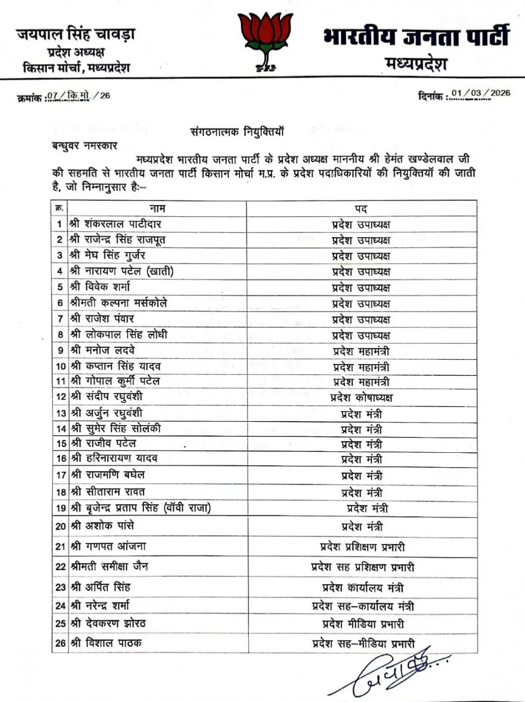 BHOPAL. मध्य प्रदेश भाजपा ने अपने किसान मोर्चा की नई कार्यकारिणी का ऐलान किया है। इस टीम में 29 पदाधिकारी शामिल किए गए हैं, जिसमें 8 उपाध्यक्ष, 3 महामंत्री और 1 कोषाध्यक्ष की जिम्मेदारी दी गई है। प्रदेश अध्यक्ष हेमंत खंडेलवाल की सहमति से यह नियुक्तियां की गईं, जिनमें कई दिग्गज नेता शामिल हैं।