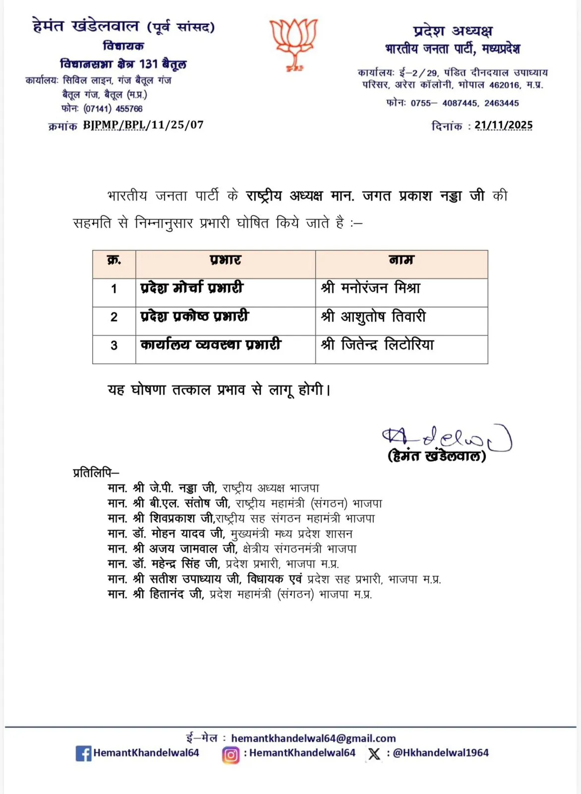 BHOPAL. मध्य प्रदेश बीजेपी संगठन में एक बार फिर नई जिम्मेदारियों का बंटवारा किया गया है। ताजा बदलाव में मनोरंजन मिश्रा को प्रदेश मोर्चा प्रभारी को बनाया गया है। पार्टी उनकी कार्यशैली को देखते हुए उन्हें यह बड़ी जिम्मेदारी सौंप चुकी है।