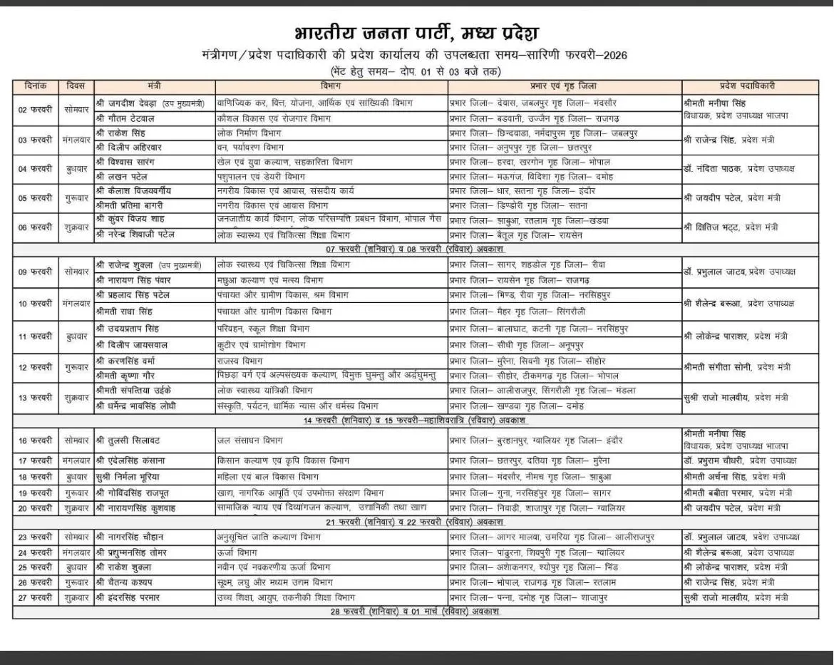 - फरवरी शेड्यूल जारी: भोपाल स्थित भाजपा कार्यालय में मंत्रियों की उपस्थिति का नया कैलेंडर जारी हुआ है।