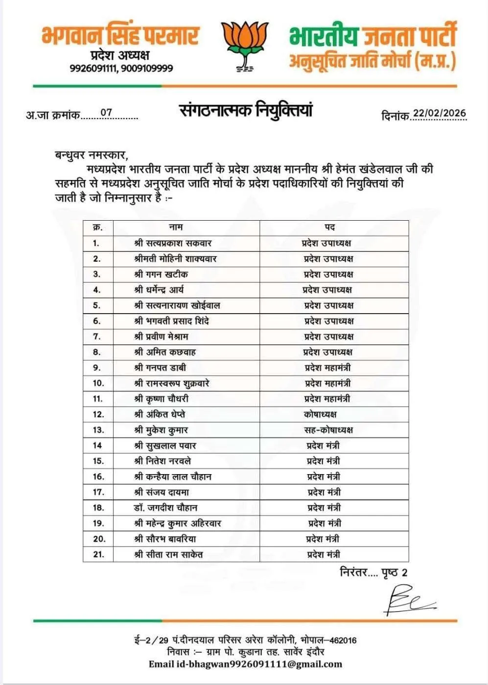 बीजेपी के अनुसूचित जाति मोर्चा (मध्यप्रदेश) की ओर से संगठनात्मक नियुक्तियों की आधिकारिक सूची जारी की गई। बीजेपी प्रदेश अध्यक्ष हेमंत खंडेलवाल की सहमति से यह कार्यकारिणी गठित की गई है। सूची में प्रदेश उपाध्यक्ष, महामंत्री, मंत्री, कोषाध्यक्ष, मीडिया, सोशल मीडिया, आईटी और नीति-शोध प्रभारी जैसे अहम पद शामिल हैं।